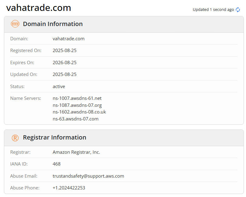 Vaha Financial的官方网站为www.vahatrade.com。据WHOIS信息显示,该域名注册于2025年8月25日,最近一次更新发生在2025年7月1日。域名已有较长运营历史,但并不能单独证明平台运营合规性或交易活跃度。