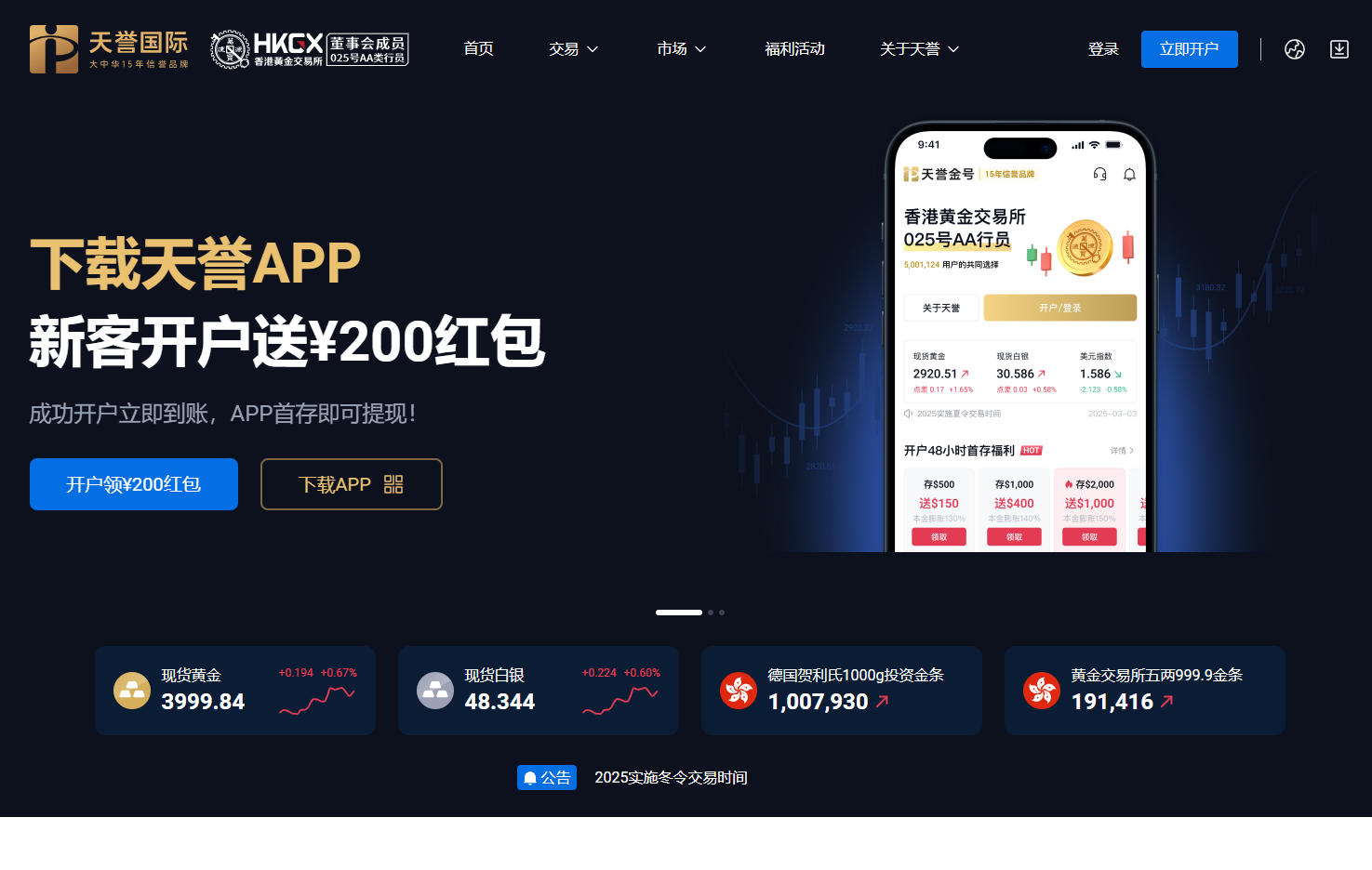 天誉国际是一家总部位于香港的贵金属交易商,主要面向全球及大中华区客户。公司提供 MetaTrader 4(MT4)交易平台,点差低至 0.01 点,并实行 零佣金,以降低客户交易成本。同时提供经济日历、市场分析与最新行情资讯,辅助投资者进行决策。