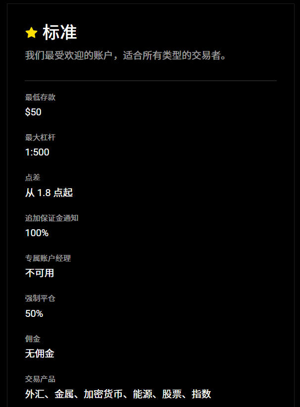 | 类型 | 最低入金 | 杠杆 | 点差 | 手续费 | 账户经理 |