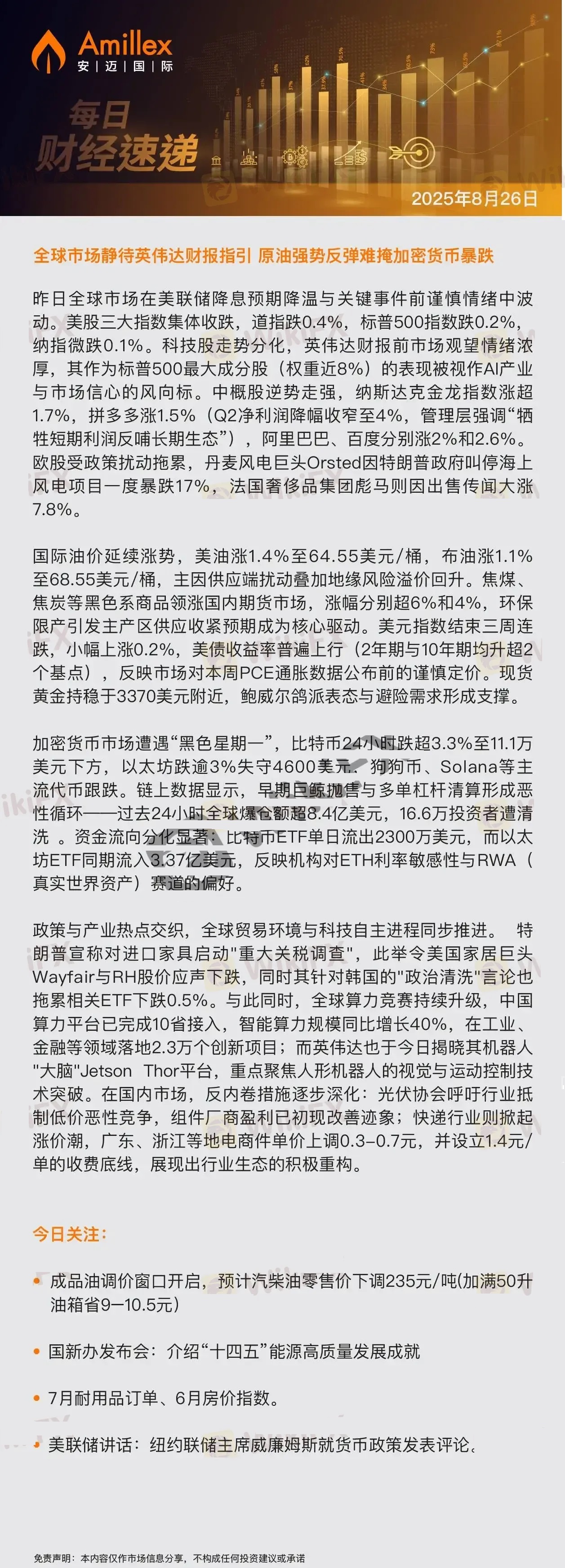 Amillex每日汇评:全球市场静待英伟达财报指引 原油强势反弹难掩加密货币暴跌