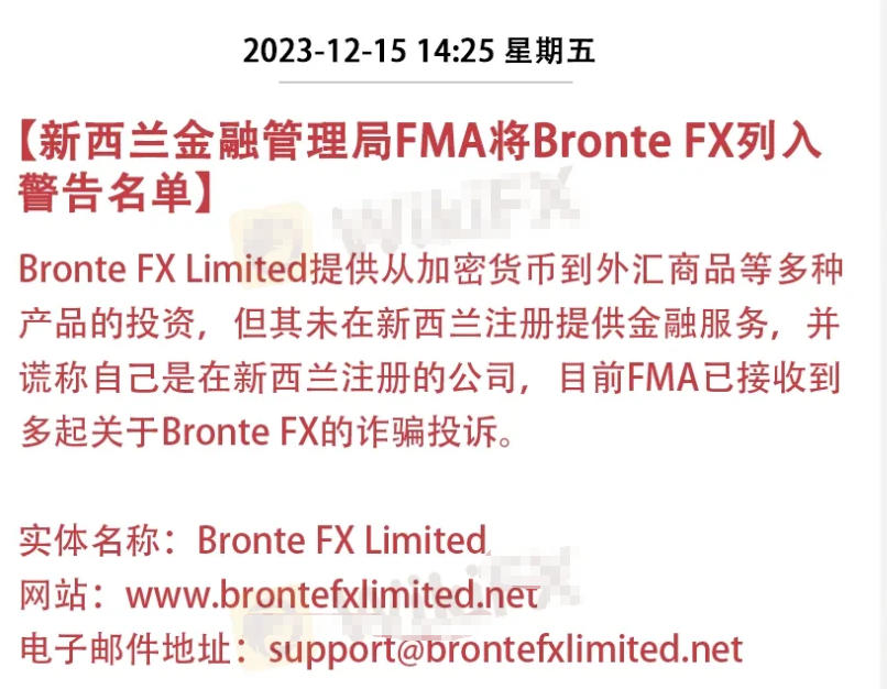 新西兰金融管理局 FMA 将 Bronte FX 列入警告名单