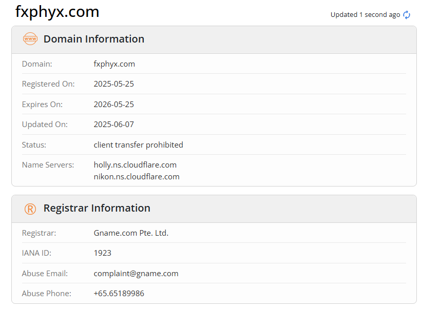 域名新生:官网 fxphyx.com 于 2025 年 5 月 25 日注册,仅存活一个多月。