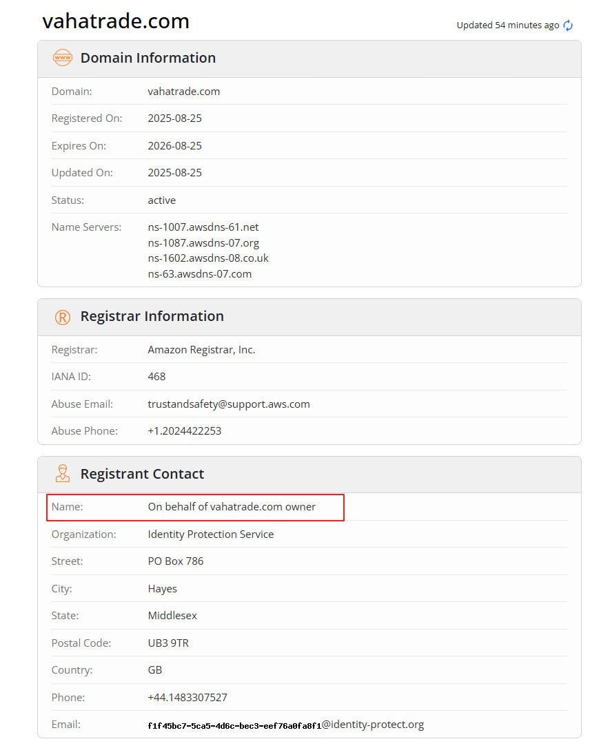 域名注册信息显示,所有者为 “On behalf of vahatrade.com owner”,而非其官网所宣称的 Vaha Financial Services Ltd。这表明域名背后实际控制人并未真实公开身份,与官网公司主体对不上号,极大增加了可信度的疑问。一个正规企业理应透明披露其域名所有权,而不是躲在模糊的代理信息背后。