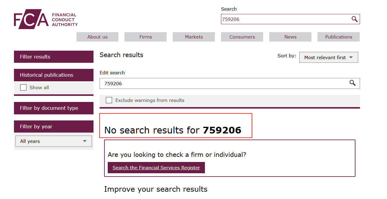 VAHA 官网声称 VAHA UK 受英国金融行为监管局(FCA)监管,监管号为 759206。然而,我们在 FCA 的官方网站上并未查到对应编号。这意味着其监管信息极大可能为伪造。监管造假是诈骗平台的典型特征,旨在制造合规与安全的假象,诱导投资者入金。