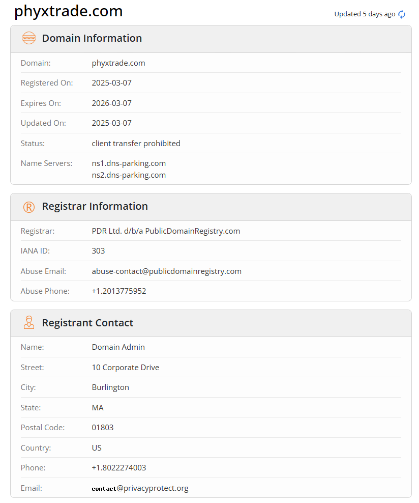 PhyxTrade的官网域名(phyxtrade.com)注册于2025年3月7日,至今仅有数月运营历史。对金融交易平台而言,过短的注册时间往往意味着缺乏足够的市场验证与品牌积累,其稳定性和长期运营能力存疑。