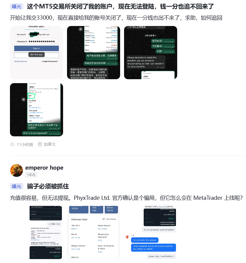 根据公开的网络信息,已有多位投资者反映在PhyxTrade平台出现提现困难甚至完全无法出金的情况。这类负面案例一旦发生,往往是平台潜在跑路,或欺诈的重要信号。