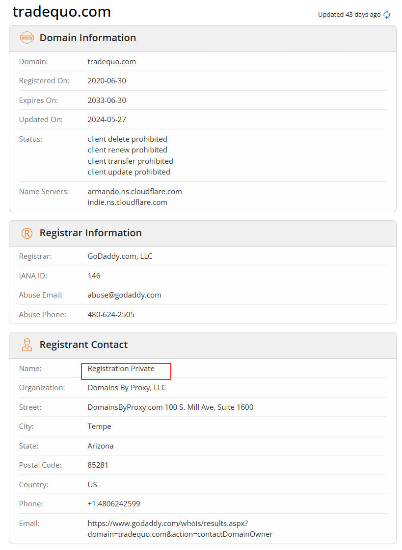 根据公开的域名查询结果,www.tradequo.com的注册人信息显示为“Registration Private”。这意味着域名所有者选择隐藏真实身份,而并非与任何合法公司主体挂钩。对于一个号称金融服务的平台而言,这种操作严重削弱了其可信度,也让投资者难以核实其背后的实际经营者。