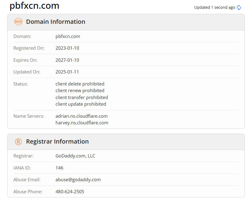 PBFX的域名 pbfxcn.com 注册于 2023年1月10日。从时间上看,该平台的线上运营历史非常短暂,这意味着它尚未在市场中形成长期信誉,也缺乏足够的行业沉淀。对于投资者而言,过于“年轻”的平台往往风险更高,因为一旦出现纠纷或资金问题,投资者很难依靠其过往口碑或行业声誉来进行验证。