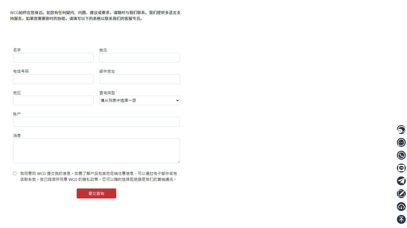 在 WCG Markets 官方网站(https://wcgmarkets.com/)上,投资者无法找到公开的 联系电话或电子邮箱。平台仅提供在线联系表单或即时通讯工具,这种方式在表面上看似便利,但一旦平台出现问题或恶意失联,用户将无法主动、及时、有效地与平台沟通,维权难度极大。