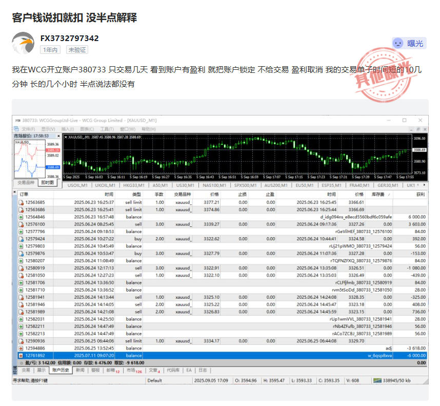 2025 年9月17日网友FX3732797342投诉:我在WCG开立账户380733 只交易几天 看到账户有盈利 就把账户锁定 不给交易 盈利取消 我的交易单子时间短的10几分钟 长的几个小时 半点说法都没有。