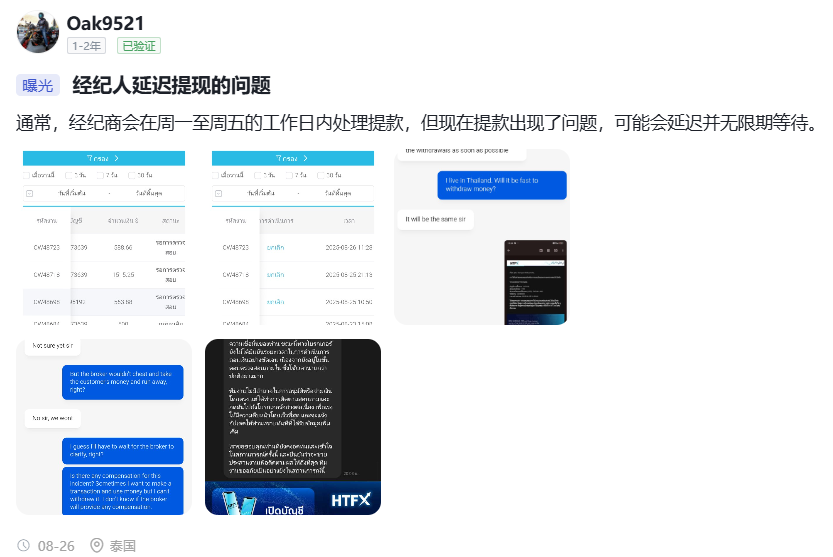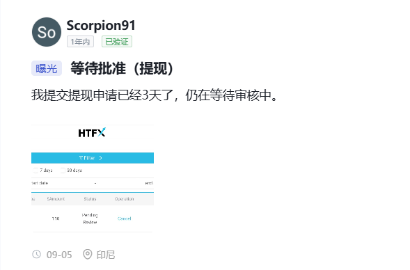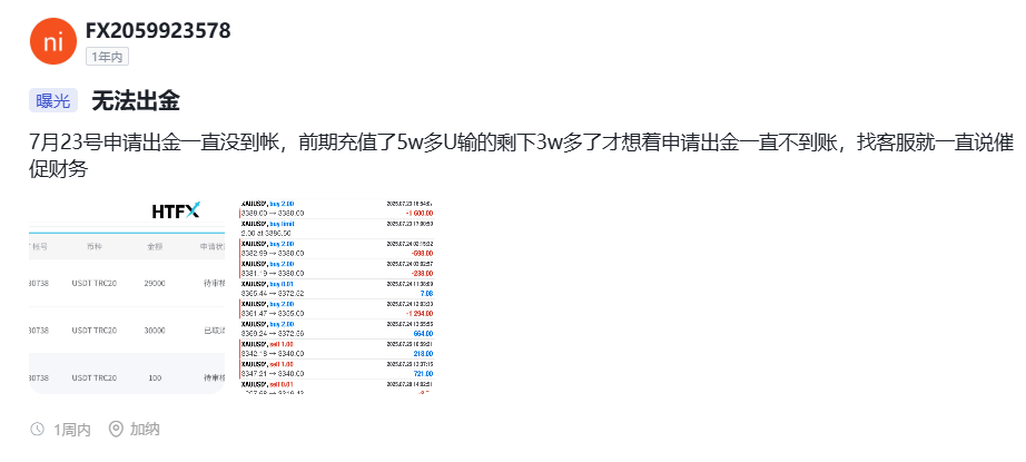 在网络投诉信息中,很多投资者反馈自己在该平台遇到了出金困难,申请提款后迟迟不到账,甚至被平台拒绝出金。同时,HTFX在处理这些投诉时并未提供透明、公正、有效的解决方案。这不仅影响了用户对平台的信任,也从侧面反映了平台可能存在的流动性风险或不合规操作。