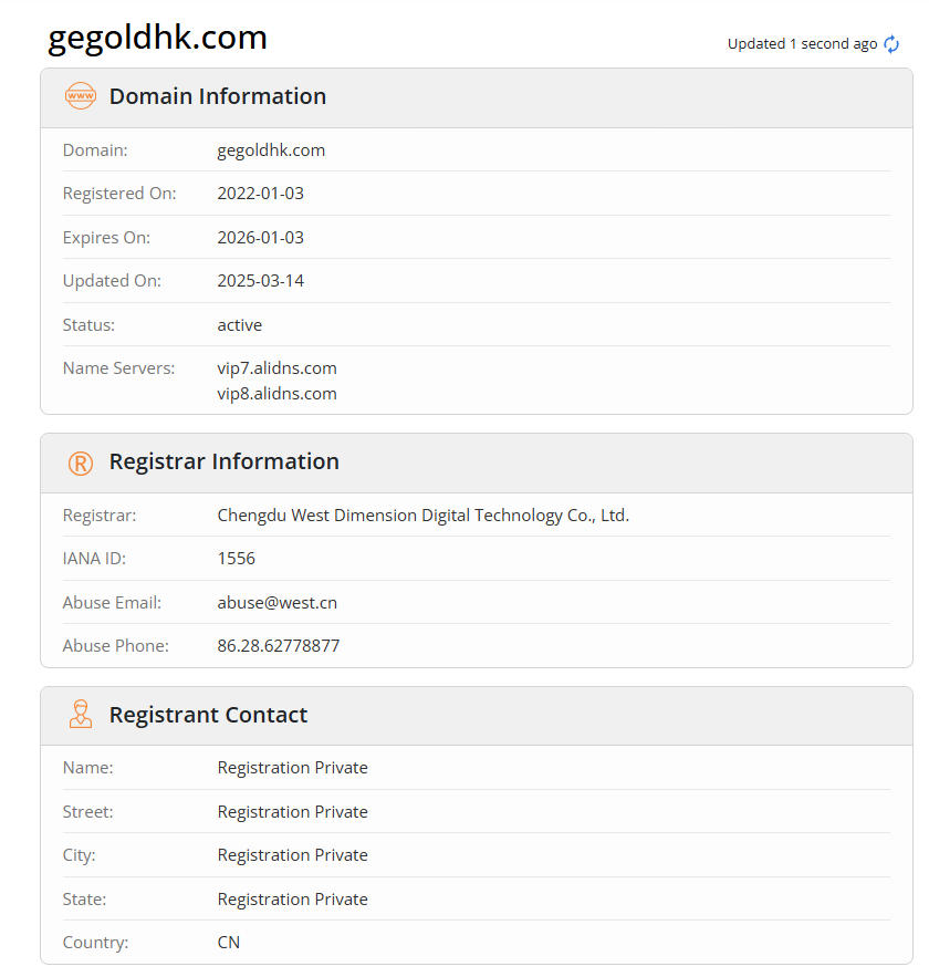 GeTrade · 巨象金业平台的官网域名 www.gegoldhk.com 的注册信息显示其所有者是个人,而不是“巨象金业”公司。这意味着官网所发布的所有宣传内容、资质声明等,并不能代表公司本身,极有可能存在公司刻意规避法律责任的情况。一旦出现纠纷或投资者维权,责任主体可能难以界定。