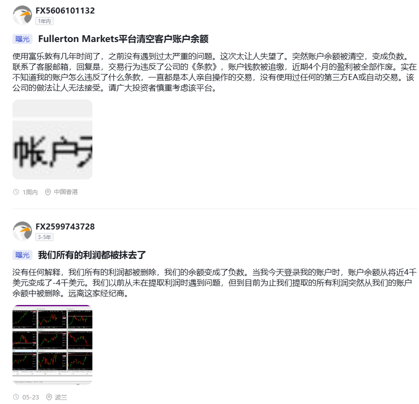 在网络公开投诉中,有用户反映 FULLERTON 平台存在恶意清空客户余额、限制资金出金等问题。这种行为直接损害投资者权益,表明其交易公正性和资金安全性存在重大隐患。