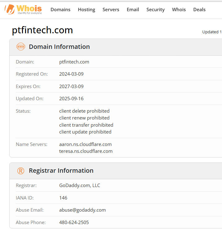 PT Fintech 的官网域名 ptfintech.com 注册于 2024 年 3 月 9 日,到目前为止时间非常短。对于金融类平台而言,域名存在时间过短,往往意味着平台缺乏历史沉淀和信誉积累。与此同时,该域名的注册和注销信息不透明,查询不到明确的公司背景和所有者信息,这让平台的真实性和可靠性大打折扣。