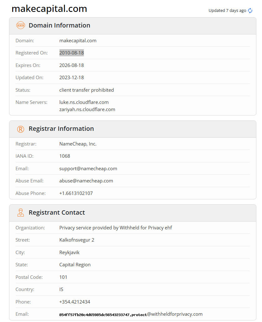 Make Capital 的官网域名 makecapital.com 查询不到任何与公司相关的注册信息,无法确认该域名与实际公司之间的关系。对于金融类平台来说,如果官网与公司主体无明确关联,往往意味着公司可能在合法性与透明度方面存在严重不足,投资者难以确认其真实身份与合规性。