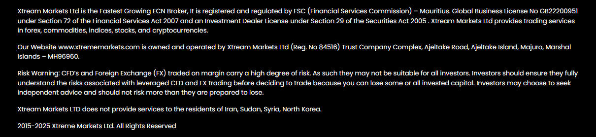 Xtreme Markets 自称由 Xtream Markets Ltd 经营,官网宣传受 毛里求斯金融服务委员会(FSC) 监管并列出牌照号/注册信息。