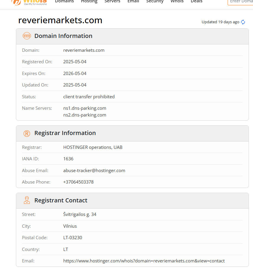 综合来看,Reverie Markets 应被归类为 “高风险 / 疑似诈骗 (scam / fraudulent)” 平台。 主要原因包括: