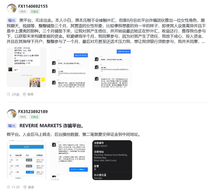 多家评估/监测机构指出,Reverie Markets 没有获得任何主流金融监管机构 (如 FCA、ASIC、CySEC 等) 的授权或监管证书。其在圣卢西亚的 IBC 注册仅代表公司法人登记,而 不代表拥有合法金融服务牌照。