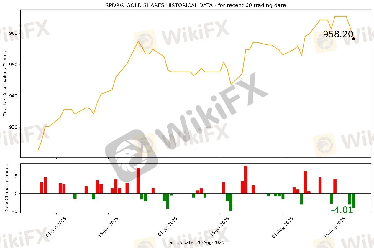 截至8月20日,全球最大的黄金ETF SPDR Gold Trust持仓量为958.2吨,较上一个交易日减持4.01吨。8月20日现货黄金整体处于震荡上行格局,开盘走低至日内低点3311.62美元/盎司,未跌破3310美元支撑位。从3320美元/盎司一线逐步走高,最高触及 3350.3美元/盎司,涨幅较为明显。结束四日连跌,收3349.367美元/盎司,涨33.857美元或1.02%。
