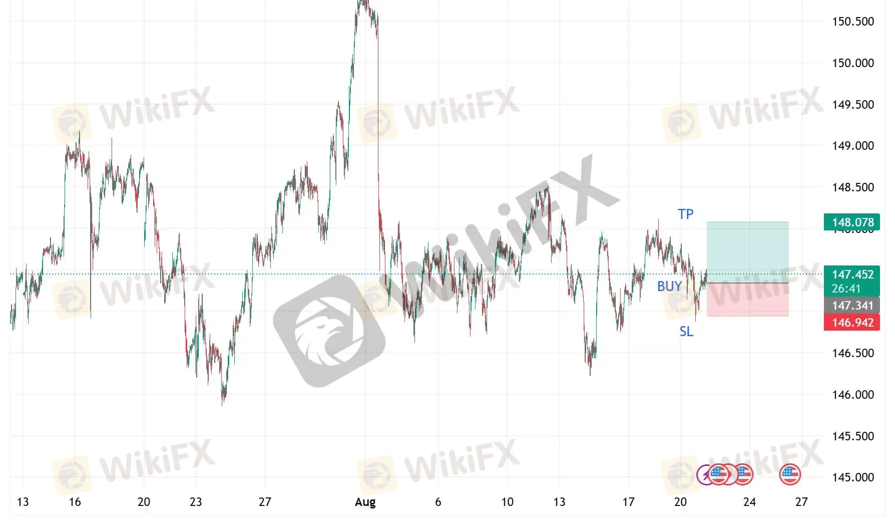 美元兑日元周三维持区间震荡,日本7月出口同比下降2.6%,为四年来最大降幅,加剧经济压力;但市场预期日本央行年内仍可能加息,与美联储潜在降息周期形成政策背离,为日元提供中期支撑。与此同时,美元指数因通胀韧性与市场削减对美联储激进降息押注而小幅反弹,限制了日元涨幅。技术面显示,147.00为关键支撑,若跌破或下探146.20–146.00;上方若企稳148.00,则有望挑战148.55–149.00区间。在政策分歧未明前,美元兑日元继续震荡整理,市场正等待美联储会议纪要及鲍威尔讲话提供方向。